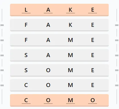 - LinkedIn Crossclimb #539 are LAKE, FAKE, FAME, SAME, SOME, COME, COMO